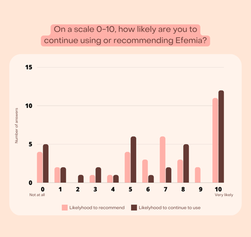 When asked, on a scale 0-10, how likely it was that they would continue to use Efemia or recommend it to a friend, the most frequent answer was 10 (very likely) and the median answer was 7.
